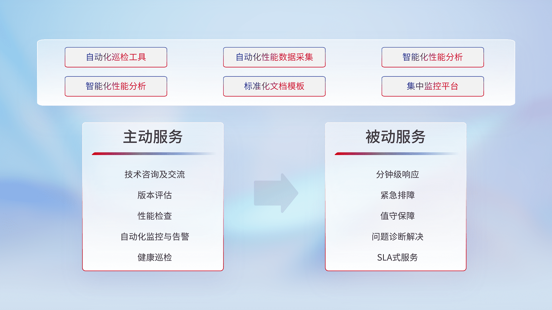 智能化工具和标准化文档,,保障服务质量,,提供主动服务(包含技术咨询、、、版本评估、、、、性能检查、、、、自动化监控与告警、、、、健康巡检)和被动服务包含(分钟级响应、、、紧急排障、、、值守保障、、问题诊断解决、、、、SLA服务)。。。